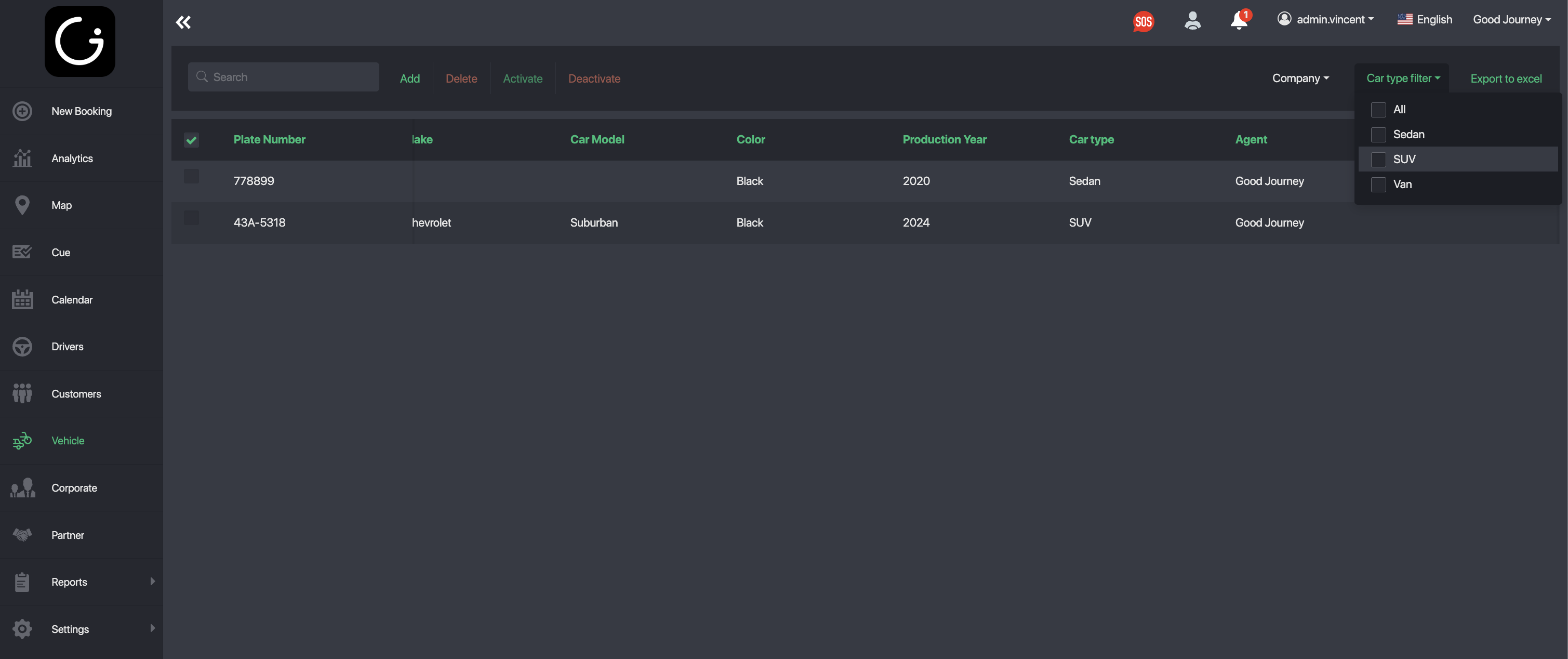 - Multi-select vehicles to activate, deactivate, or delete them in bulk.