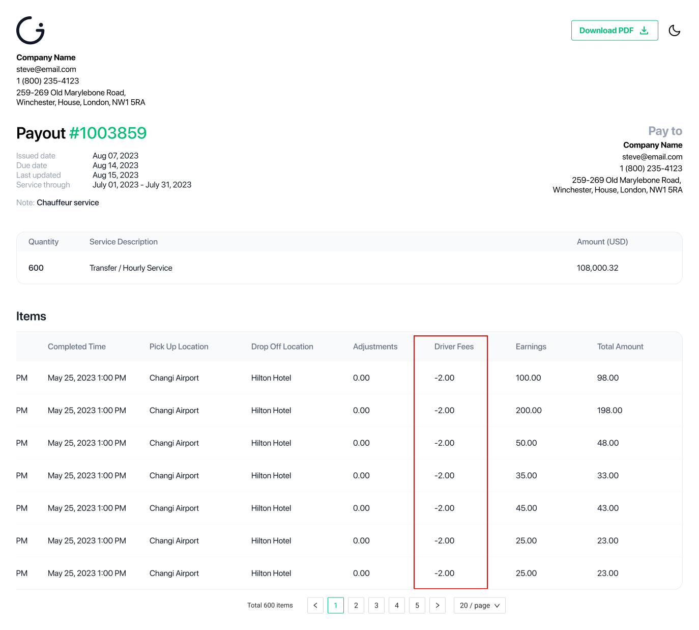 In addition partners using the advance payout module will also include driver fees deducted from their wallets and shown in payout statements