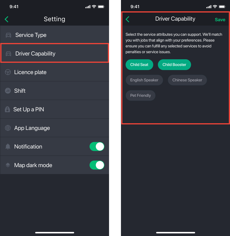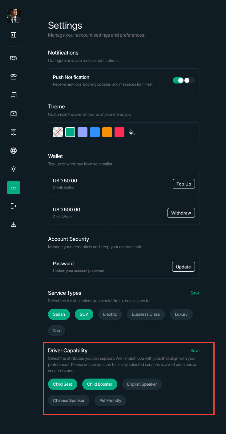 - Fleets can optionally enable a setting that allows drivers to manage their own driver attribute preferences. This gives drivers control to opt out of certain attributes and avoid receiving specific types of bookings that do not match their preferences.