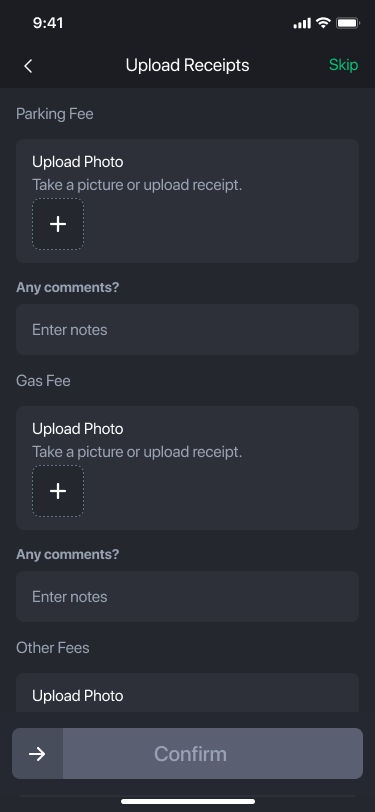 - At the end of a trip, drivers may be required to upload supporting receipts or add notes related to specific add-ons or incurred expenses. Examples include parking fees, toll charges, or other trip-related costs.