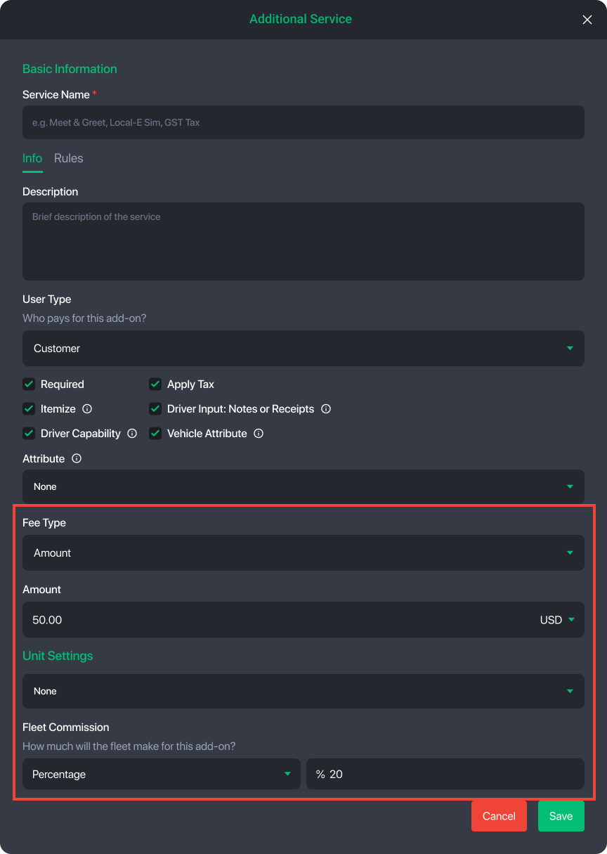 Define how much the fleet earns from this add-on (percentage or fixed value).