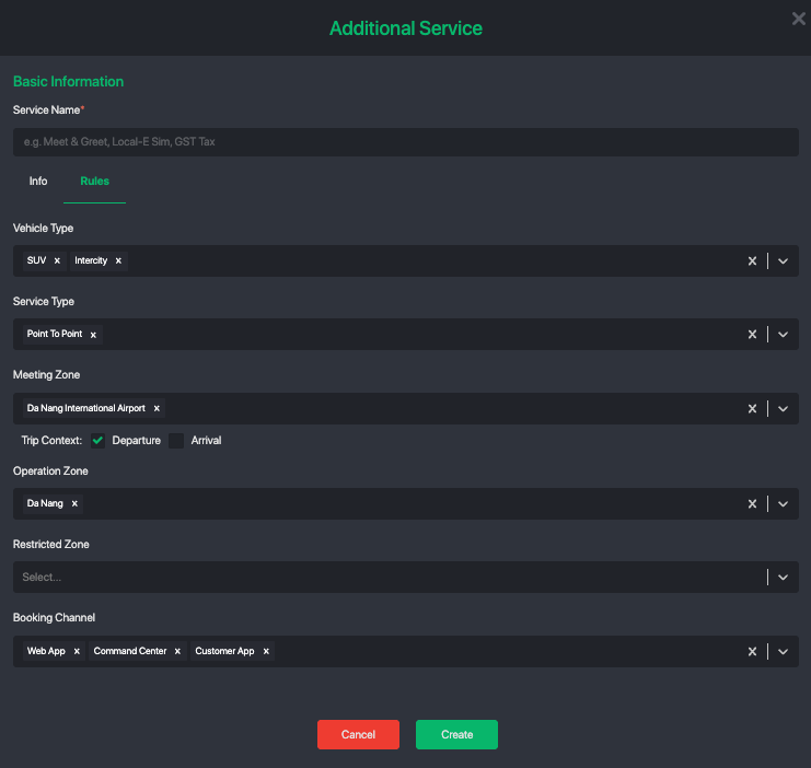 Apply the add-on only to specific vehicle categories (e.g. Sedan, Van, Business Class). - Service Type