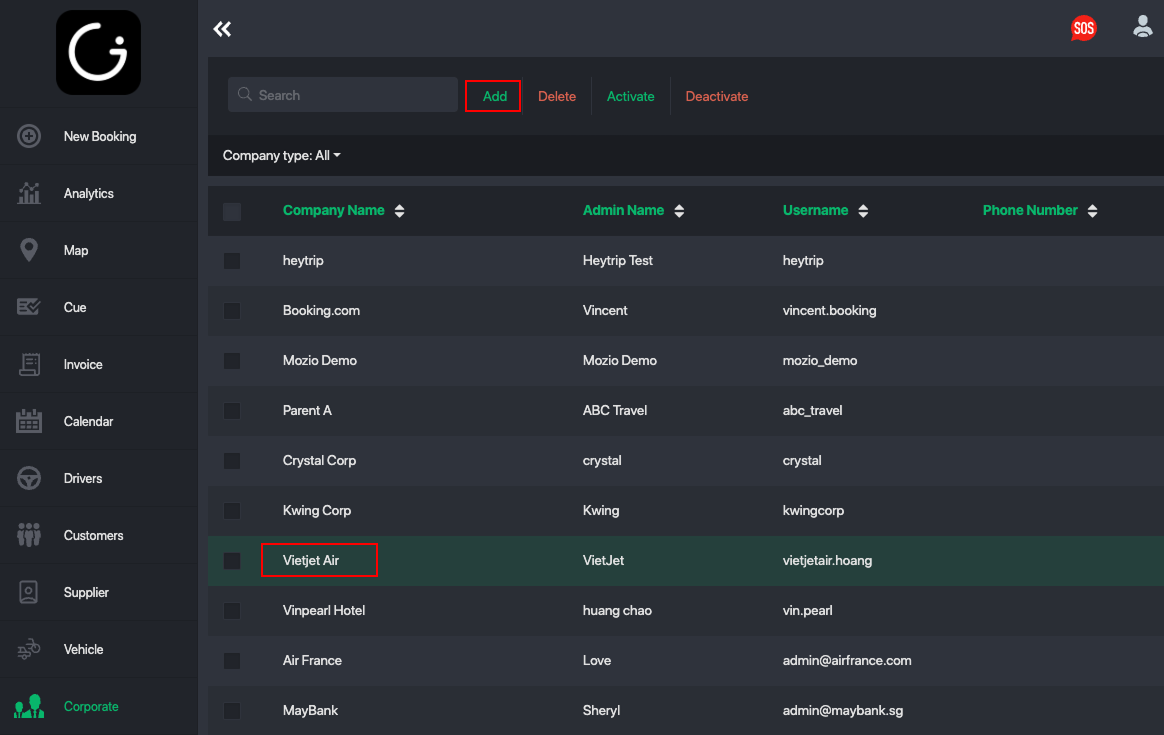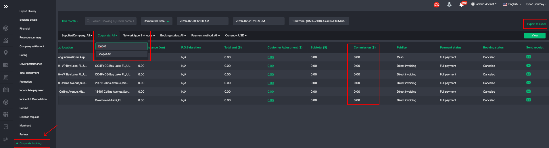 Navigate to Reports > Corporate booking to pull the commission data for each partner: