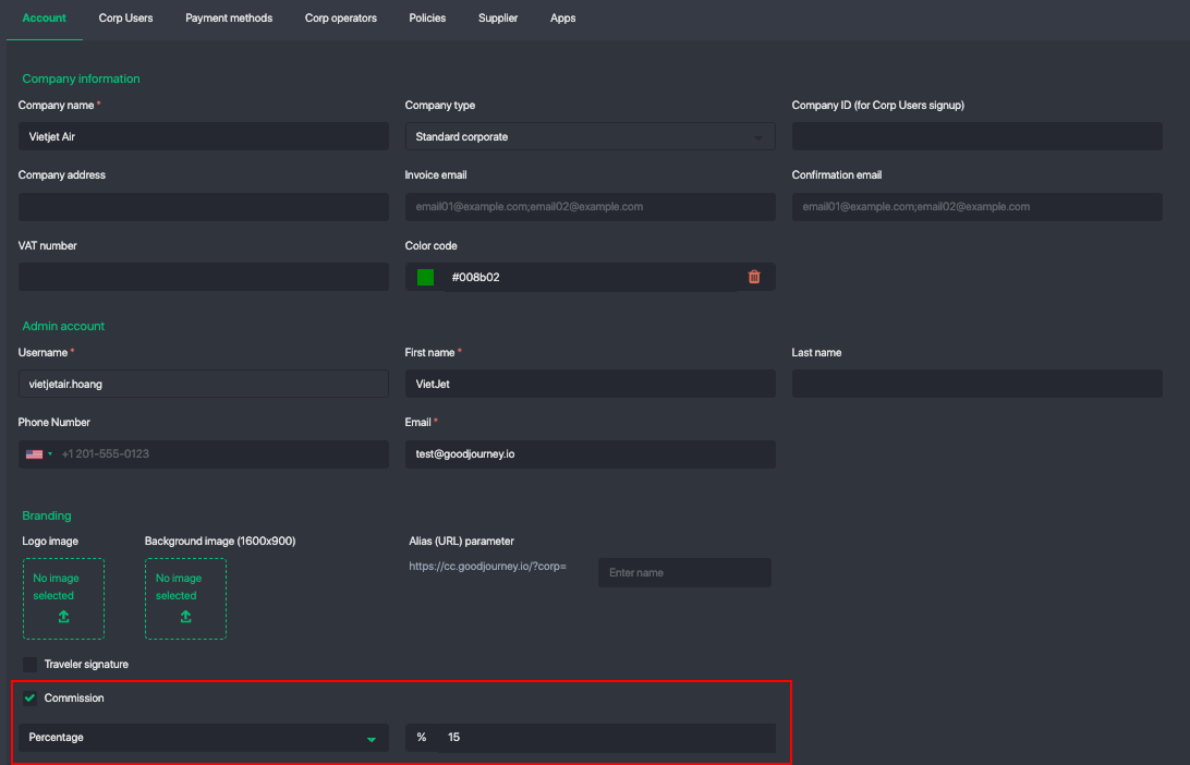 You can define a commission rate for each corporate account: