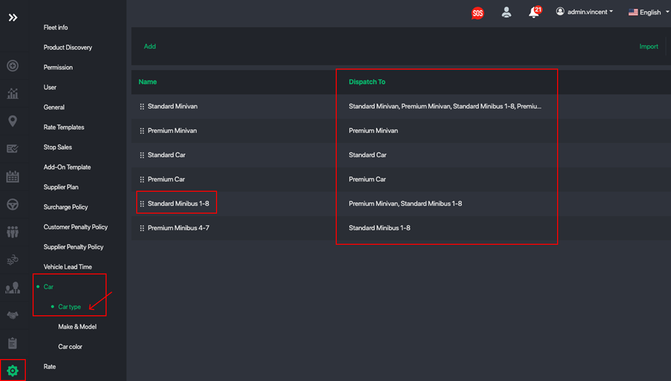You will notice the Dispatch to column is now updated with the list of car types can receive the specific jobs.