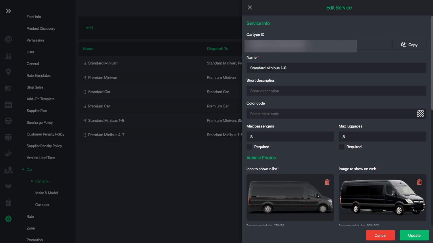2. Select a car-type you want to update the association for. Let say for car-type Premium Minibus 1-8
