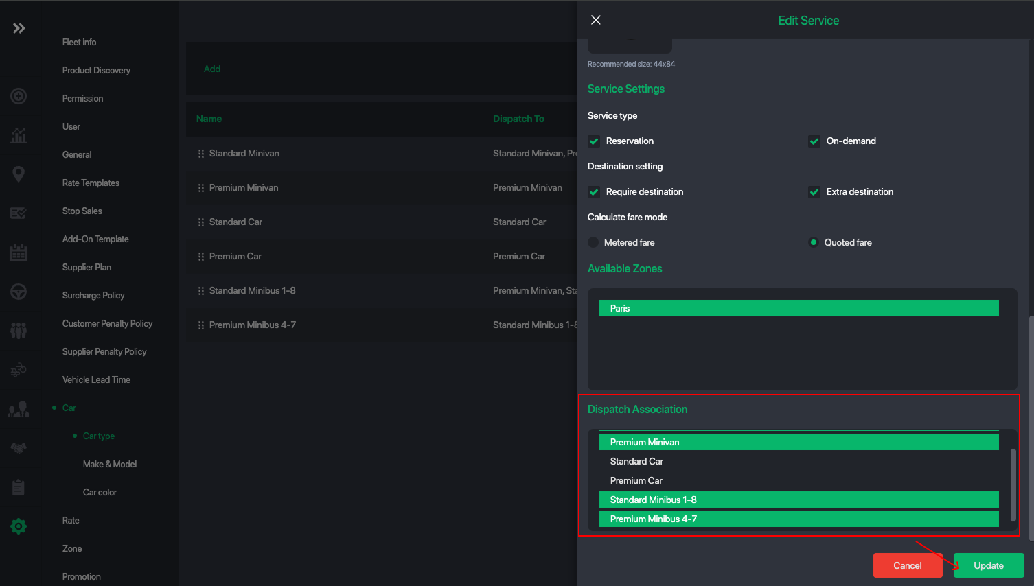 Dispatch association allows you to control which drivers can receive jobs based on car-type compatibility.