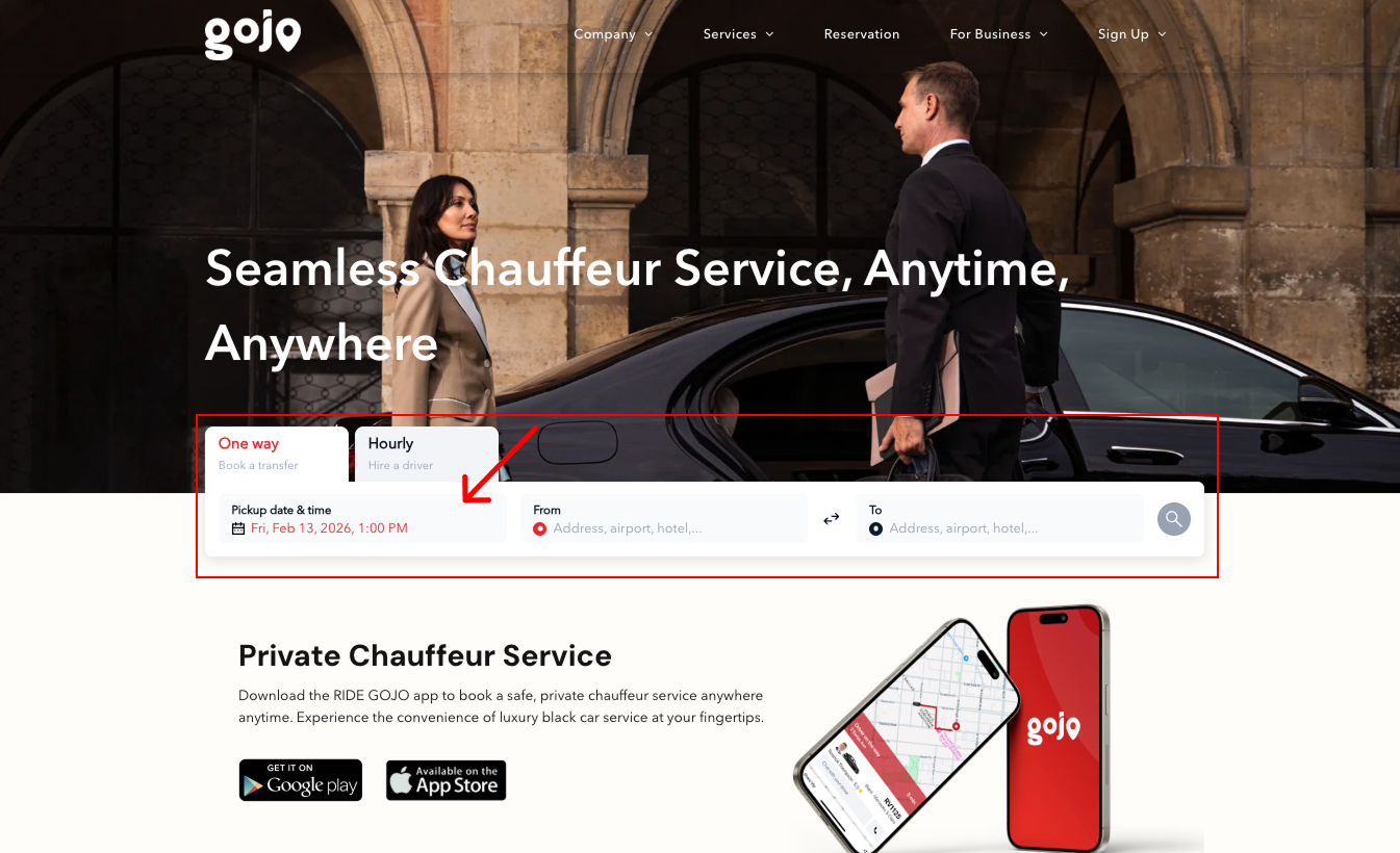 Once installed, you can test the embedded booking experience. When a customer enters their pickup location, destination, and date/time, then clicks Search, they will be redirected to your dedicated booking page (for example, /booking) where the Booking Web App is embedded. The vehicle selection screen will load directly within your website, allowing customers to continue the booking process seamlessly without leaving your domain, as shown below: