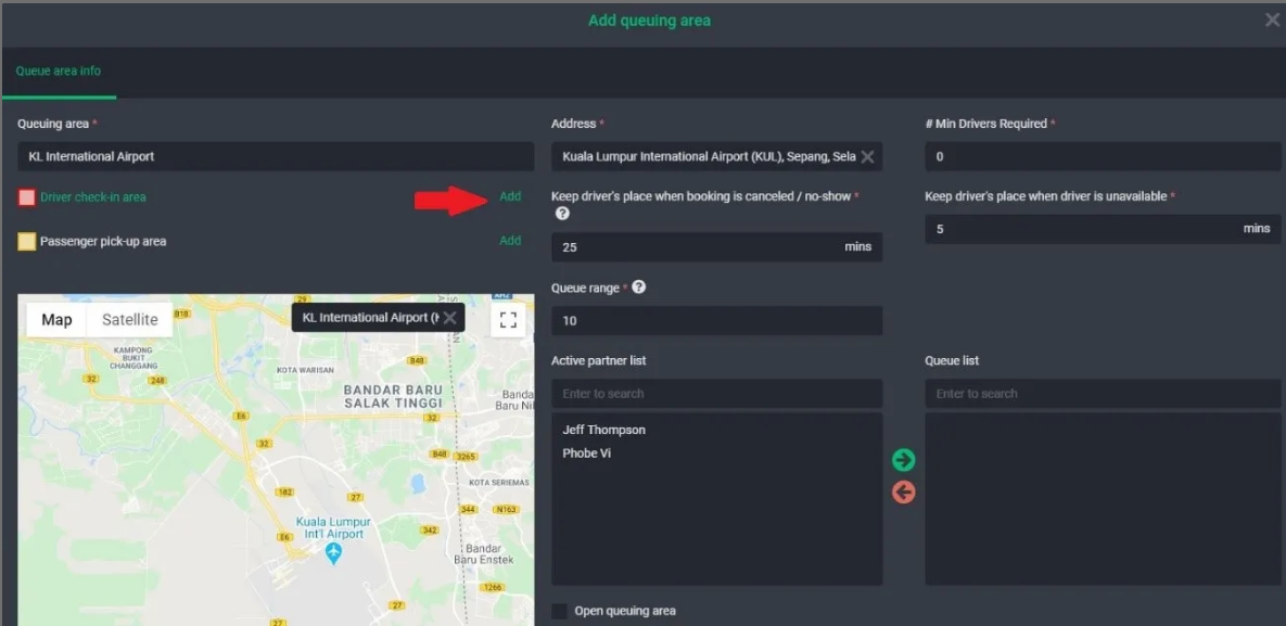 - Open queuing area option: Enabling this option allows all drivers to "check-in." If disabled, only assigned drivers can do so. This setting lets you control who can check in the queue