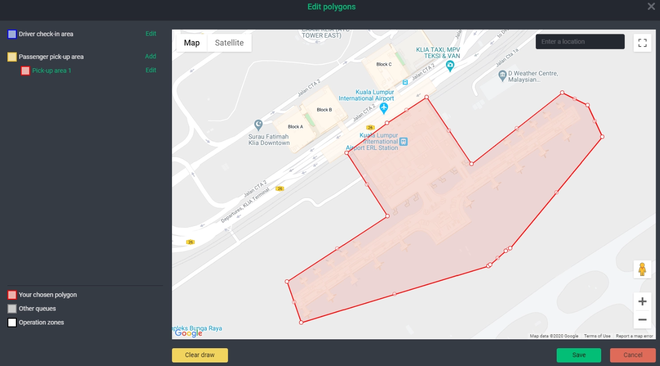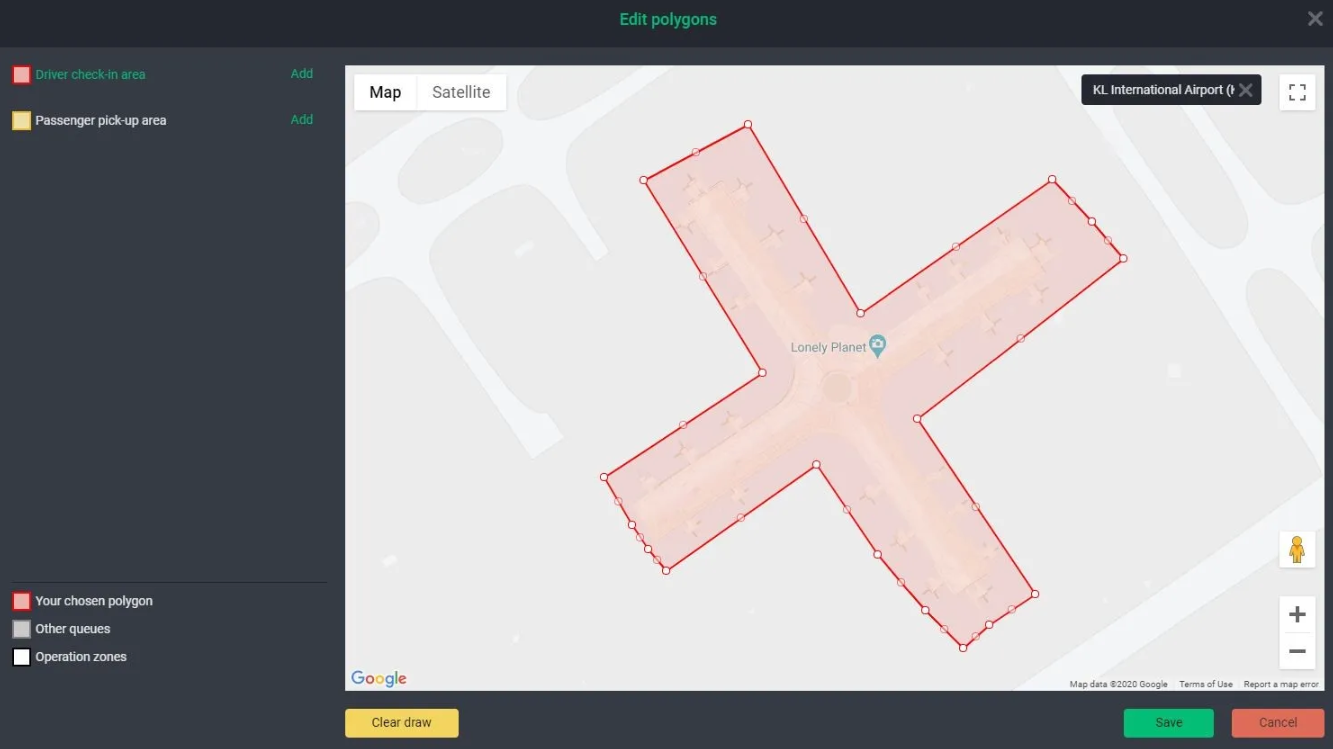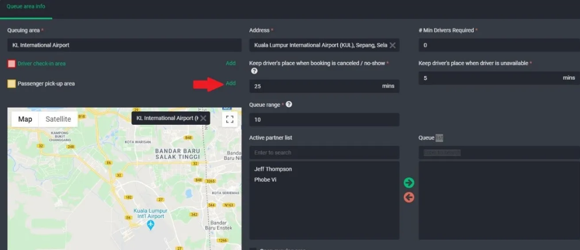 It supports creating separate zone areas for driver check-in and passenger pick-up. This setting is designed to accommodate most airports, where designated areas are assigned for pick-up and drivers need to park in different locations.